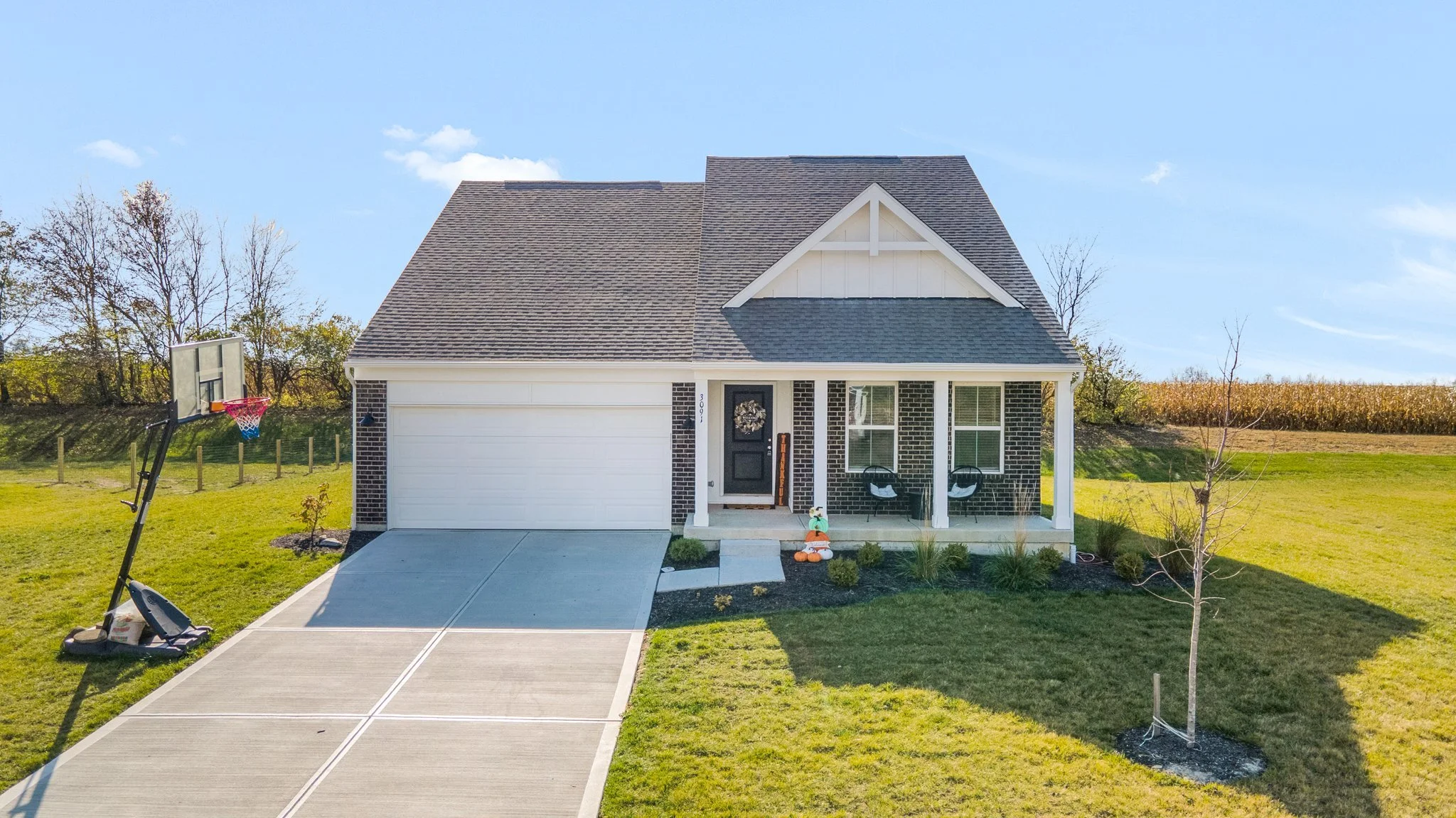 Front view of a modern suburban house with a landscaped yard, porch with chairs, and a basketball hoop on the driveway.